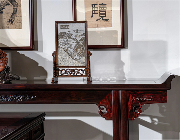 條案案面兩端設(shè)翹頭,線條挺括而不僵硬、柔和而不纖弱;案面下牙條正中雕刻雙龍紋,卷云紋的牙頭,寓意吉祥如意。